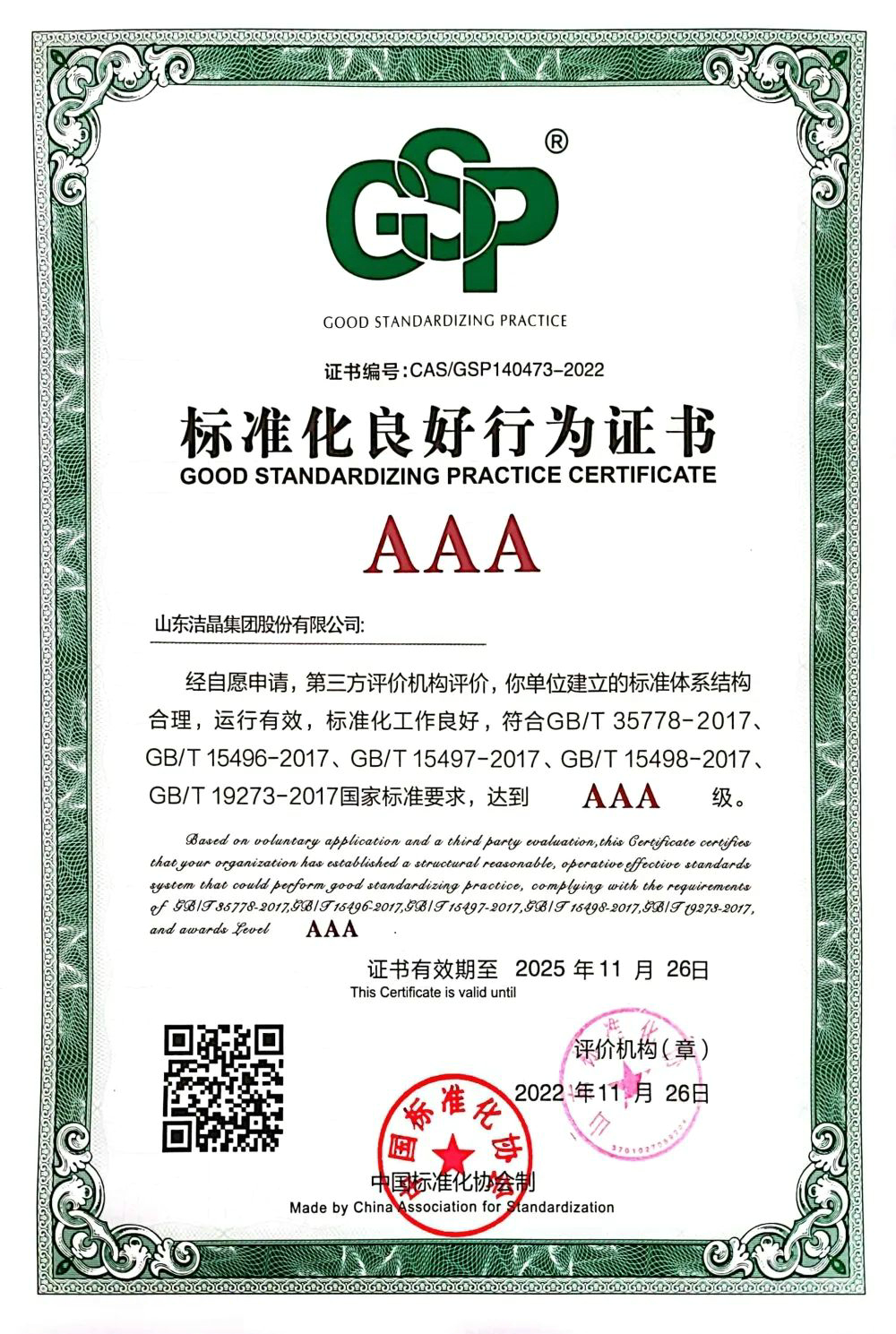 2022年11月26日,經(jīng)前期申報及第三方評價機構(gòu)評價審核,潔晶集團獲得AAA級標準化良好行為證書。